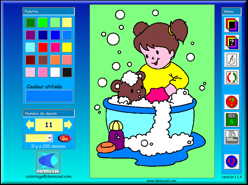 Coloriage est un jeu de coloriage pour les plus petits. Il comprend 200 dessins de différents thèmes. Coloriage permet de colorier des dessins grâce à une palette de couleurs, une pipette est disponible pour retrouver une couleur déjà utilisée. Il est ensuite possible de sauvegarder son dessin sur son ordinateur.